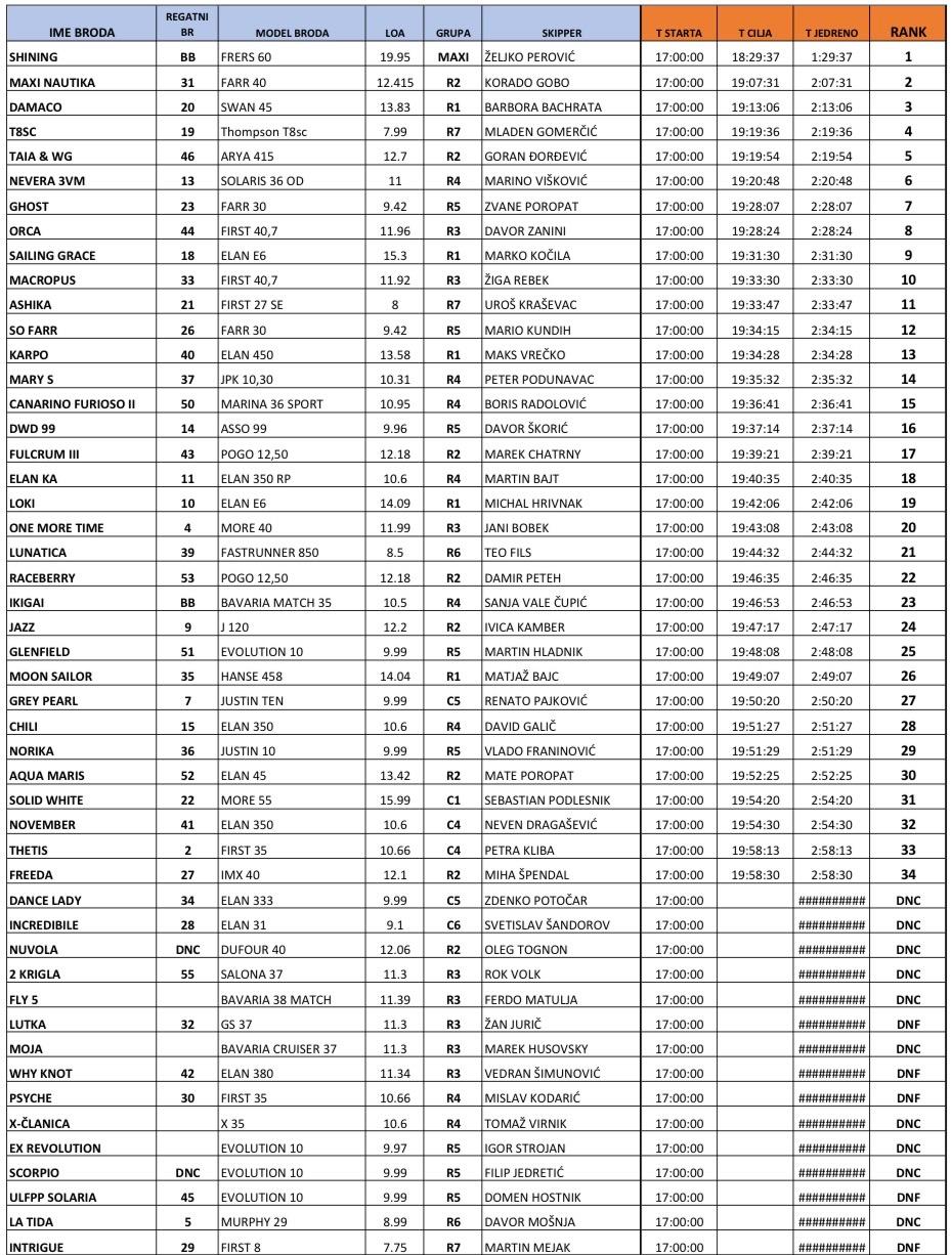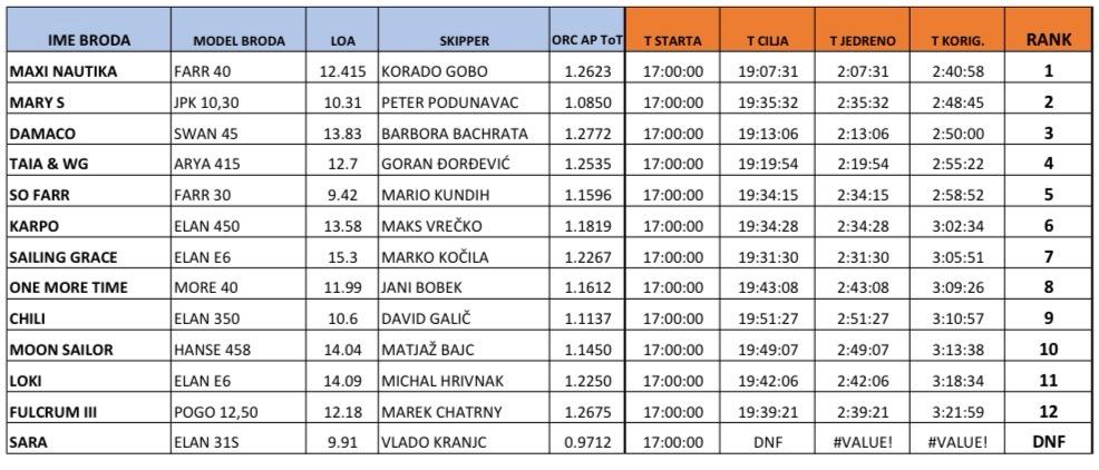 U obje etape na vrhu su bili Maxi Nautica i Mary S. U noćnom jedrenju Maxi Nautica je odnijela pobjedu sa skoro 8 korigiranih minuta prednosti, dok je u jurcanju po Istri Mary S bila brža za oko 24 korigirane minute.
