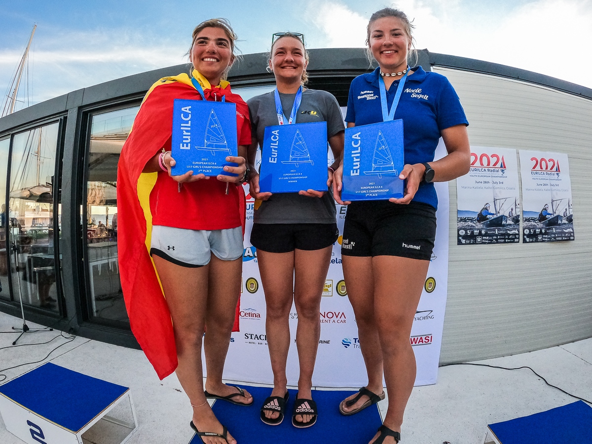 Među djevojkama, Čehinja i Irkinja ponovno su se zamijenile na rezultatskoj ljestvici. Tako da je pobjedu odnijela čehinja Alessia Palanti koja je bila vrlo dobra i jedan put ušla treća a drugi put druga u ta dva jedriličarska plova. Irkinja prvi plov dana završila kao jedanaesta, ali je zato pobijedila u posljednjem plovu prvenstva. Međutim čehinja je imala dosta stabilnije jedrenje tako da je sa šest bodova razlike osvojila Europsko Prvenstvo. Skupa s njima na postolju bila je još i ruska jedriličarka Alexandra Lukoyanova.