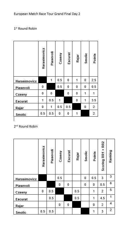 Generalni plasman se dobiva zbrojem rezultata iz jednog i drugog RR, ali s obzirom da kormilari nemaju jednak broj matcheva oni koji su odjedrili i u jednom i u drugom RR, a pobijedili su, umjesto jednog boda dobivaju po 0.5 bodova. Tako da se konačna rezultatska situacija morala sagledati iz prilagođene tablice.