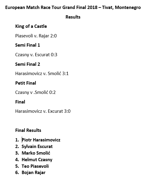 European Match Race Tour je u Tivtu organizirao finale ovogodišnje sezone. I ove godine je ciklus krenuo u veljači iz Šibenika, pa su nakon toga regate organizirane u Tivtu (Crna Gora), Podersdorfu (Austria), Gothenburgu (Švedska), Copenhagenu (Danska), Swinojuscie (Poljska), Ravenna (Italija) i na kraju ponovno u Tivtu regata o kojoj je ovdje riječ. Ukupno je sudjelovalo 38 posada iz 14 Europskih država!