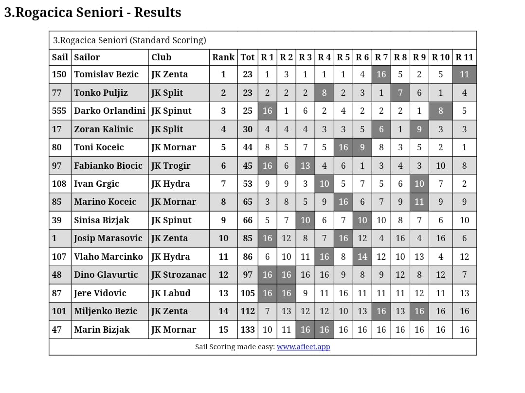 Što se tiče seniora, tu je borba za prvo mjesto bila neizvjesna do posljednjeg plova. Najuvjerljiviji u 11 odjedrenih plovova i na kraju pobjednik, bio je Tomislav Bezić (JK Zenta) - lanjski pobjednik jednako kao i Marin Bizjak. Do pobjede je stigao s 23 kaznena boda, jednako kao i drugoplasirani Tonko Puljiz iz JK Split.